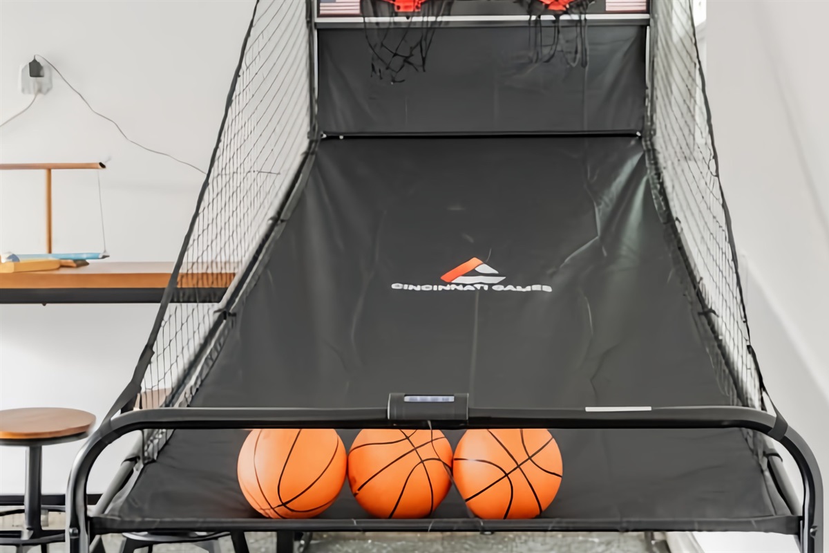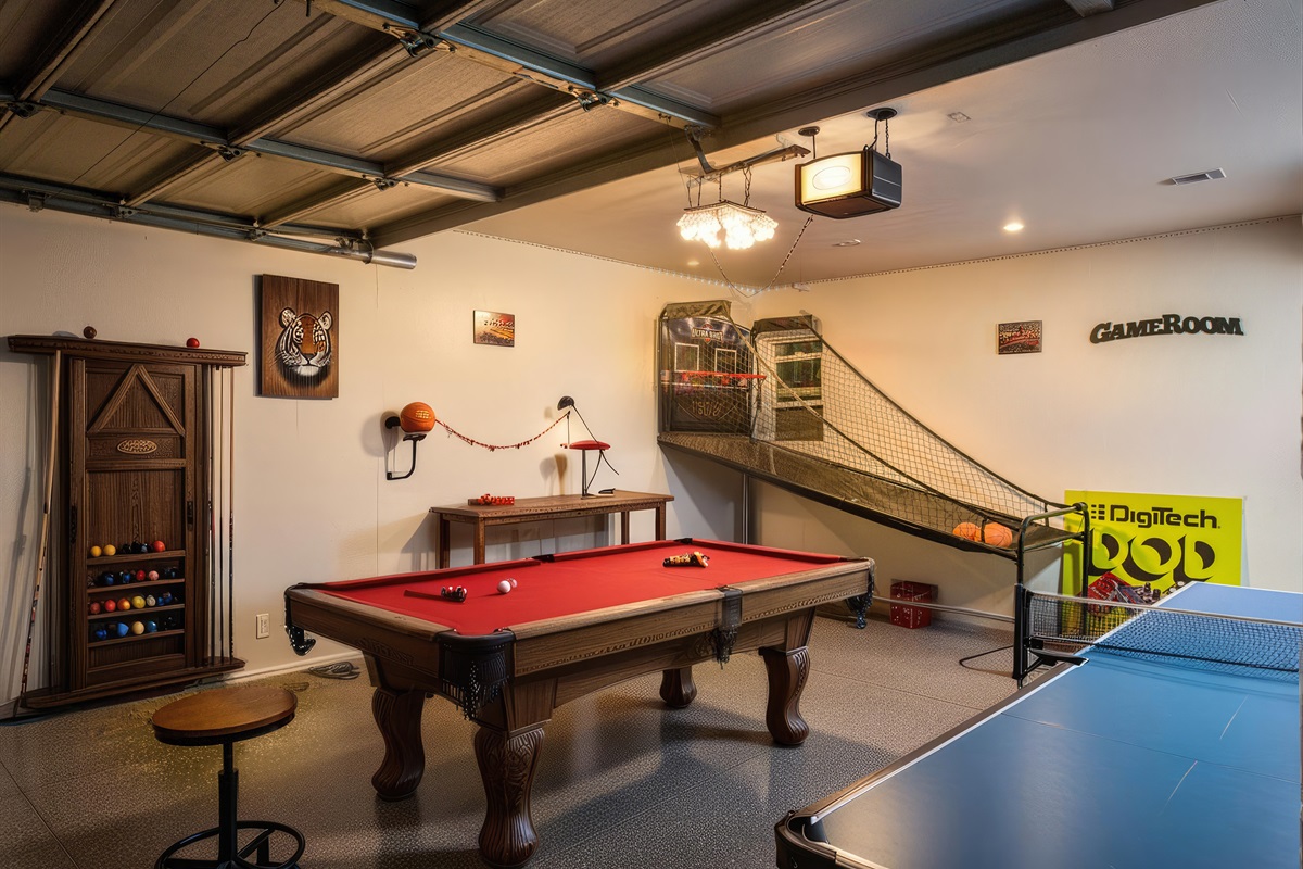 The converted garage game room provides entertainment for guests of all ages and is perfect for relaxing evenings or downtime between outings.