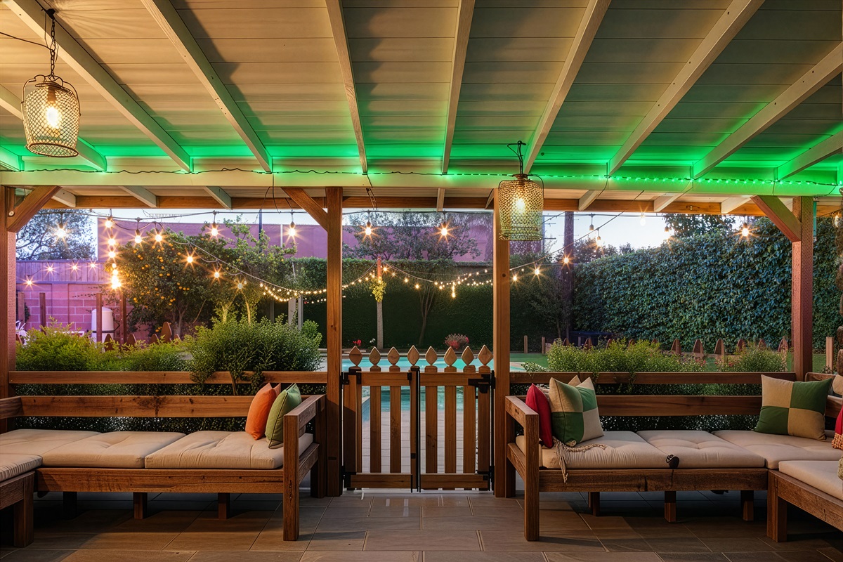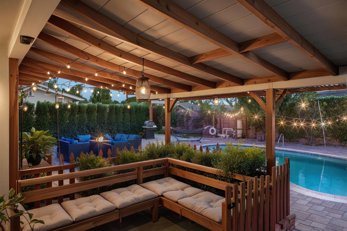 The backyard offers a private outdoor setting ideal for relaxing after a full day of activities.