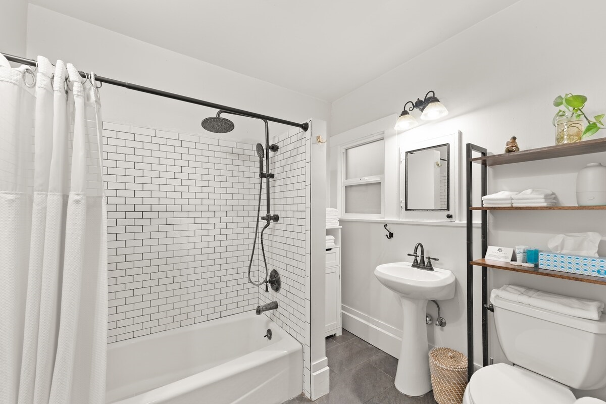 Wash up in the bright full bathroom with a single vanity and shower/tub combination. This space offers plenty of space to unpack all your toiletries and provides shampoo and body wash so you don’t have to bring your own.